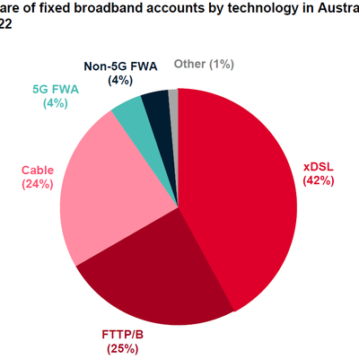 截止到 2022 年,澳大利亚的光纤接入只占整体固定宽带的 25% 份额。而高达 42% 的用户仍然通过陈旧的 xDSL 接入(速率通常只有几十 Mbps)。