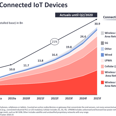 IoT Analytics 咨询公司的一项研究,其估算了 2015 到 2025 全球各类物联网设备的数量(根据网络接入技术)。