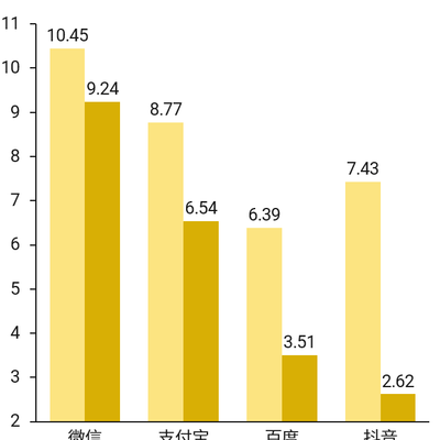附图来自 QuestMobile 在 2023Q3 的数据监测,对比超级 APP 的用户基数,微信的小程序用户(去重后)占比是高的,显著高于其他几个超级 APP。