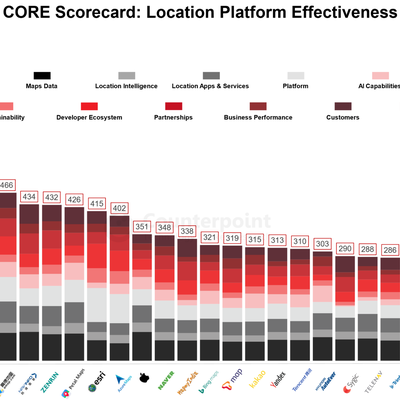 Counterpoint Research 将基于地理位置的开放平台(Location Platform)定位为 10 大类能力,分别是: (1) Maps data; (2) Location intelligence; (3) Location services; (4) Data platform; (5) AI capabilities; (6) Sustainability; (7) Developer ecosystem; (8) Pa
