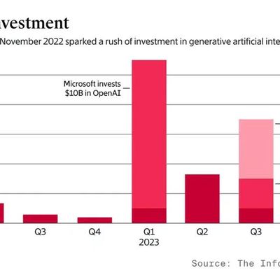 The Information 汇总了生成式 AI 在 2022Q1-2024Q1 九个季度的风险投资情况。如果把 OpenAI、Anthropic 的几倍巨额投资分开,更多投资倾斜到了 AI 应用层。