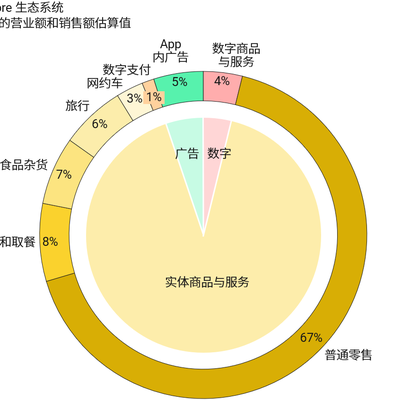 从类别看,91% 的生态系统营业额来自实体商品与服务,5% 来自 App 内广告,4% 来自数字商品与服务。