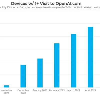 数据监测机构 Datos 的研究现实,OpenAI.com 的月度访问量自 2023 年 5 月高点以来,到 7 月访问流量下滑了 29%。这个变化趋势和 Similarweb 之前对 ChatGPT 的流量判断类似。