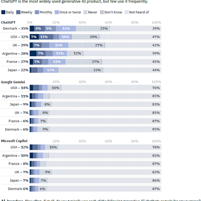 Reuters Institute 和牛津大学的一项调研,针对美国、阿根廷、日本、英国、法国和丹麦用户对 ChatGPT, Gemini, Copilot 等生成式 AI 的工具的使用情况。