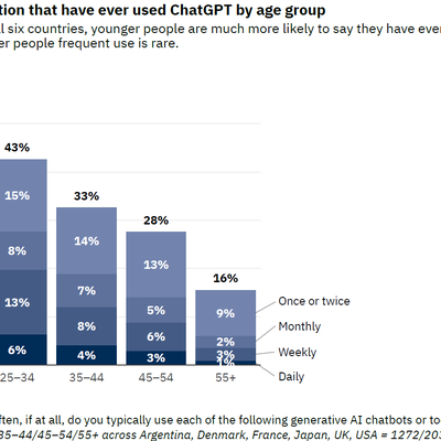 Reuters Institute 调研显示,ChatGPT 的使用频度和用户的年龄是否年轻呈现正相关。
