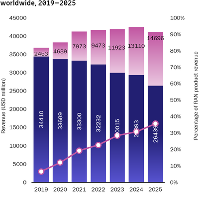 根据 Analysys Mason 的研究,2020 年虚拟化的无线网络产品收入约占整体市场的 12%,预计到 2025 年这一比例会上升到 36%。