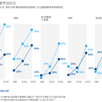 附图来自 IBM 针对电信运营商业者的调研,可以看到未来 2~5 年,所有的调研对象都表示将通过外包获得第三方云提供商带来的好处。