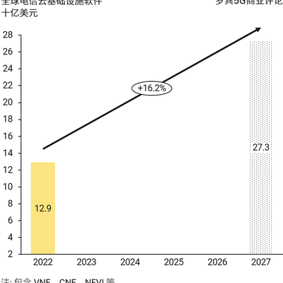 根据 IDC 咨询公司的研究,电信网络基础设施云化的软件部分市场空间在 2022 年为 129 亿美元,预计到 2027 年会提升到 273 亿美元,CAGR 为 16.2%