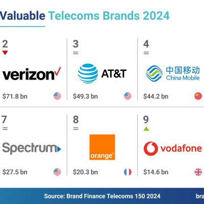 在 Brand Finance 评选的 2024 版全球电信运营商品牌资产排名 Top 10 中,T-Mobile、Verizon 和 AT&T 位居前三位。