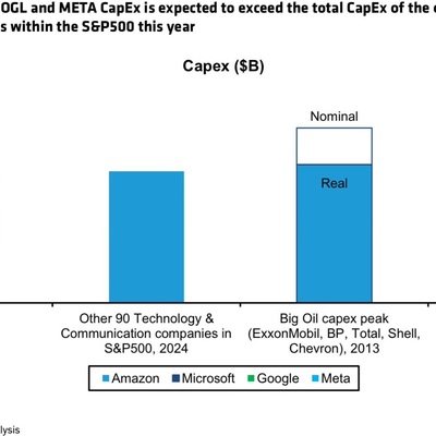 Amazon、Microsoft、Google 和 Meta 四家公司在 2024 年的 CAPEX 投资接近 2,000 亿美元,比标普 500 其他 90 家科技和通信公司的 CAPEX 总和还要多。