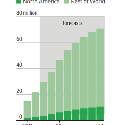 WSJ 绘制了一张图表展示了全球电动汽车的产能和产地分布。预计到 2030 年全球电动汽车的年产能可达 7,000 万辆左右。