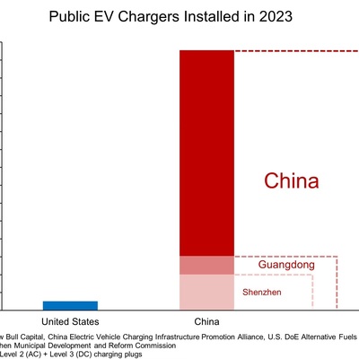 Snow Bull 的研究显示,中国已安装的公共充电桩数量是美国的 33 倍,且差距在进一步扩大。