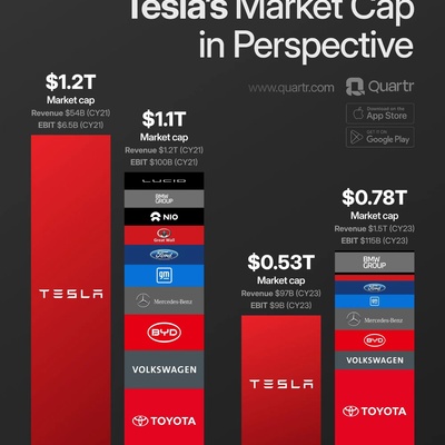Quartr 对比了 2021-11-05 和 2024-04-03 两天主要汽车品牌企业的市值。