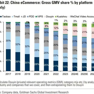 附图来自投资银行高盛的研究,根据 GMV 交流额看各家电子商务平台的份额变化。