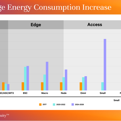5G 和边缘计算的兴起可能会带来电力能耗的大幅提升。根据 Vertiv 和 451 Research 的一项研究,对比 2019 年的状态,运营商在 2026 年的移动网络能耗将增长 150~170%。