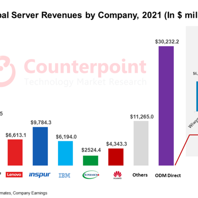 根据 Counterpoint 的研究, 2021 年全球服务器收入数据中,来自白盒 ODM 的收入已经达到了 302 亿美元,远超传统的服务器品牌商。