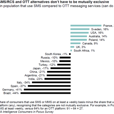 附图的数字是某个市场,用短信的渗透率与 OTT 消息渗透率的对比。比如:以法国为例 91% 的人会每周至少用一次短信,而 64% 的人会每周至少用一次 OTT 消息。法国在下图的得分为:91% - 64% =