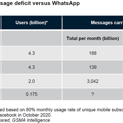 GSMA 的一项研究,估算了全球短信的业务量,并和 Facebook 旗下 WhatsApp 进行了比较。
