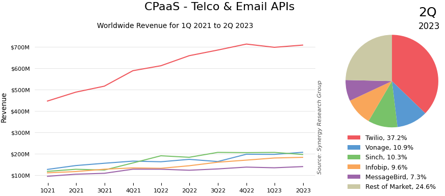 根据 Synergy Research 的研究,2023 年全球 CPaaS 的市场空间为 80 亿美金,预计到 2025 年将提升到 100 亿美金。