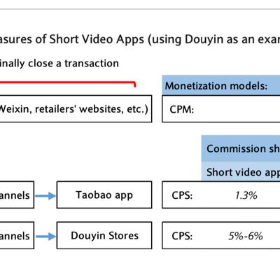 ⑵ 抖音和淘宝的直播频道,交易在淘宝闭环:商品销售的 20% 作为渠道佣金,其中短视频 App 分成 1.3%,电商平台 7.4%,MCN及主播分成 11.3%。 ⑶ 商户直接在抖音上开店,(不需要淘宝):抖音分掉 5~6%, MCN及主播获得 14~15%。 这三种模式是有一定的逻辑演化顺序的,模式一短视频仅仅是媒介;模式二短视频参与电商交易闭环;模式三短视频直接做电商。