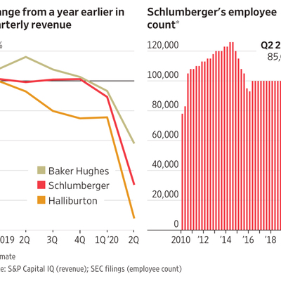 据华尔街日报报道,斯伦贝谢将在 2020Q2 裁员 21,000 人,贝克休斯减员 15,000 人。英国石油巨头 BP 也将减员 10,000 人。