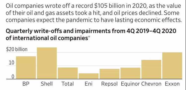 根据 WSJ 的统计,传统能源企业在整个 2020年市值损失高达 1050 亿美金。而与之对比的是新能源汽车的不断走高,以及整个美股大盘的大牛市。