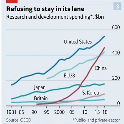 经济学人的一张图标展示了 1981 年依赖,主要经济体在研发领域的投资开销。