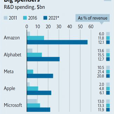 根据 The Economist 对北美五大科技公司(Alphabet、Amazon、Apple、Meta 和 Microsoft)的财务数字分析看,巨头们现在是两手抓:一手抓研发,一手抓 CAPEX 投资。