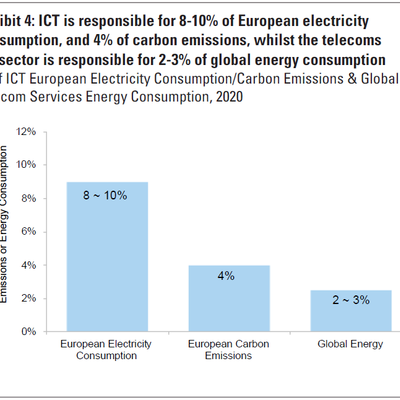 高盛的一项研究提及,ICT 企业消耗了欧洲 8-10% 的电力,4% 的碳排放。