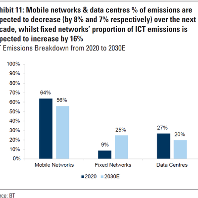 移动网络是碳排放的大头,但到 2030 年比例会下降到 56%;数据中心的排放也会下降。