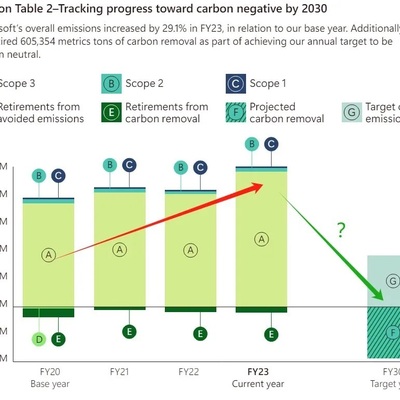 Microsoft 信息披露现实,其在 2023 年的碳排放量对比其指定的基准年份(2020年)提升了 29.1%。