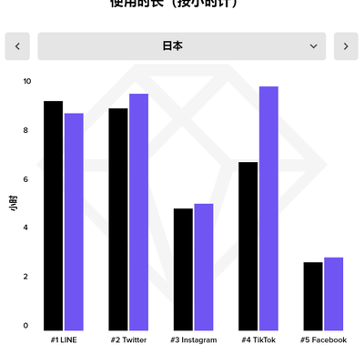 来自 App Annie 的监测数据,2020年日本社交网络 Top 5(按用户使用时长)为 Line、Twitter、Instagram、TikTok 和 Facebook。
