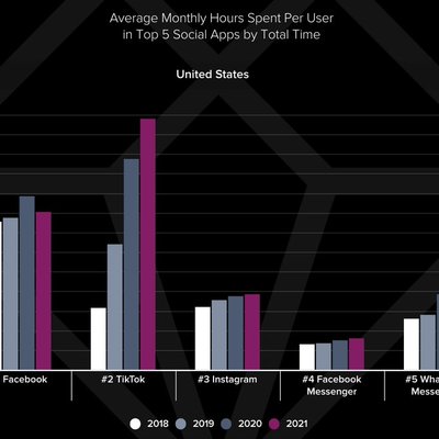 2018 年美国用户平均每个月会花费 6 个小时在社交网络 App 上,2021 年这个数字猛增到 26 小时,主要是因为字节跳动旗下的 Tiktok。