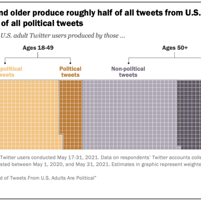 Pew Research Center 抓取了 2020 年 5 月到 2021 年 3 月的 Twitter 用户发帖,并进行了发帖人年龄和内容分析。