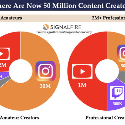 根据 SignalFire 的估计,国际市场内容创作者的用户规模有 5,000 万,其中全职投入的 “Professional Creators 职业创作者” 有 200 万以上,而业务兼职投入的 “Amateur Creators 业余创作者” 数量为 4,670 万