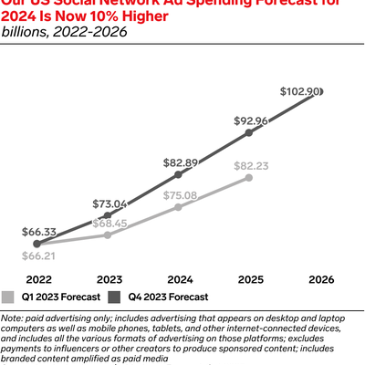 eMarketer 于 2023Q3 修正了年初的预测,围绕美国社交网络的广告开支。