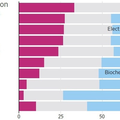 WSJ 绘制了一张图,展示了美国科研学术论文和中国的合作比例。从行业分布看,电信行业的合作是最深入的,其次是纳米科学和电子电气工程。