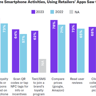 Airship 针对北美、西欧、东南亚和巴西的消费者调查显示,对比 2022 年,消费者在零售品牌商的门店内使用智能手机的活动大幅增加。