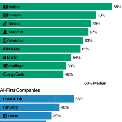 红杉资本的一项研究显示,生成式 AI 的代表性应用(ChatGPT、Runway 等)在用户留存率和用户参与度方面均不及传统的移动互联网头部应用。