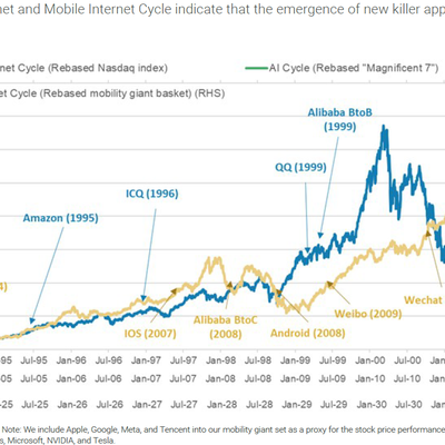 Morgan Stanley 绘制了一张图,试图展示桌面互联网、移动互联网和 AI 三个周期的全景图,从股票指数的角度。