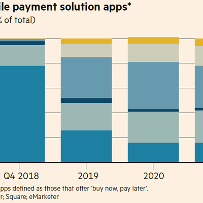 附图来自 Financial Times,美国移动支付 App 的下载份额分布。直观感觉就是美国移动支付还处于发展期,集中度偏低。