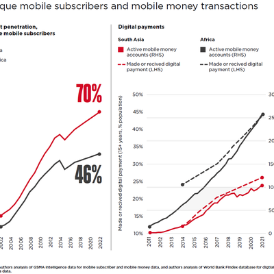 GSMA 分析了南亚和非洲的移动业务渗透率、移动支付的账户数和渗透率。可以清晰地看到,两者的相关性。
