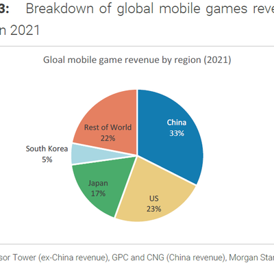 Morgan Stanley 分析了全球移动游戏 2021 年按国家的收入构成。