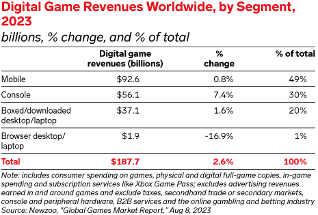 从终端和游戏类型看,移动游戏占据了 49% 的半壁江山,基本保持稳定;主机游戏 2023 年的收入为 561 亿美元,同比大增了 7.4%。桌面电脑下载的游戏也维持了 20% 的份额,基本稳定。