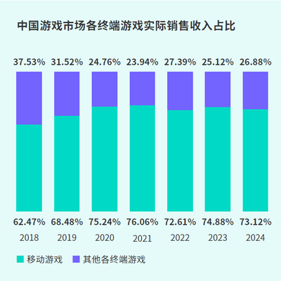 从终端分布角度,73.12% 收入是移动游戏,其他终端游戏占比 26.88%。