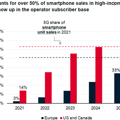 考虑到用户更换手机频率放缓,预计2025 年北美的移动用户 5G 渗透率可达 67%,欧洲渗透率为 33%。