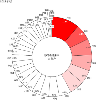 从头部省份看,移动电话超过 5% 份额的省份有:广东、山东、江苏、河南、四川和浙江。