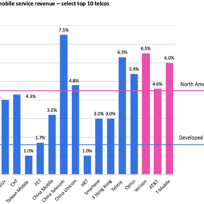 2021 年北美运营商的移动业务平均收入增幅为 4.5%,亚太发达市场的移动业务平均收入增幅为 1.2%。