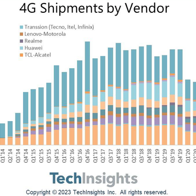 2023Q1 全球 4G LTE 的终端出货量下降到了 9,600 万部,大致相当于 4G 规模上市两年后 2014Q1-Q2 的状态。