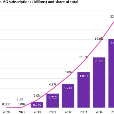 移动通信大约每 10 年发展一代。OMDIA 预测 2030 年 6G 网络将开始规模发展用户,预计到 2035 年全球 22.3% 的用户将使用 6G。